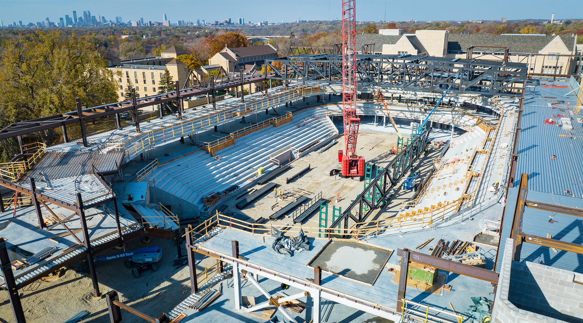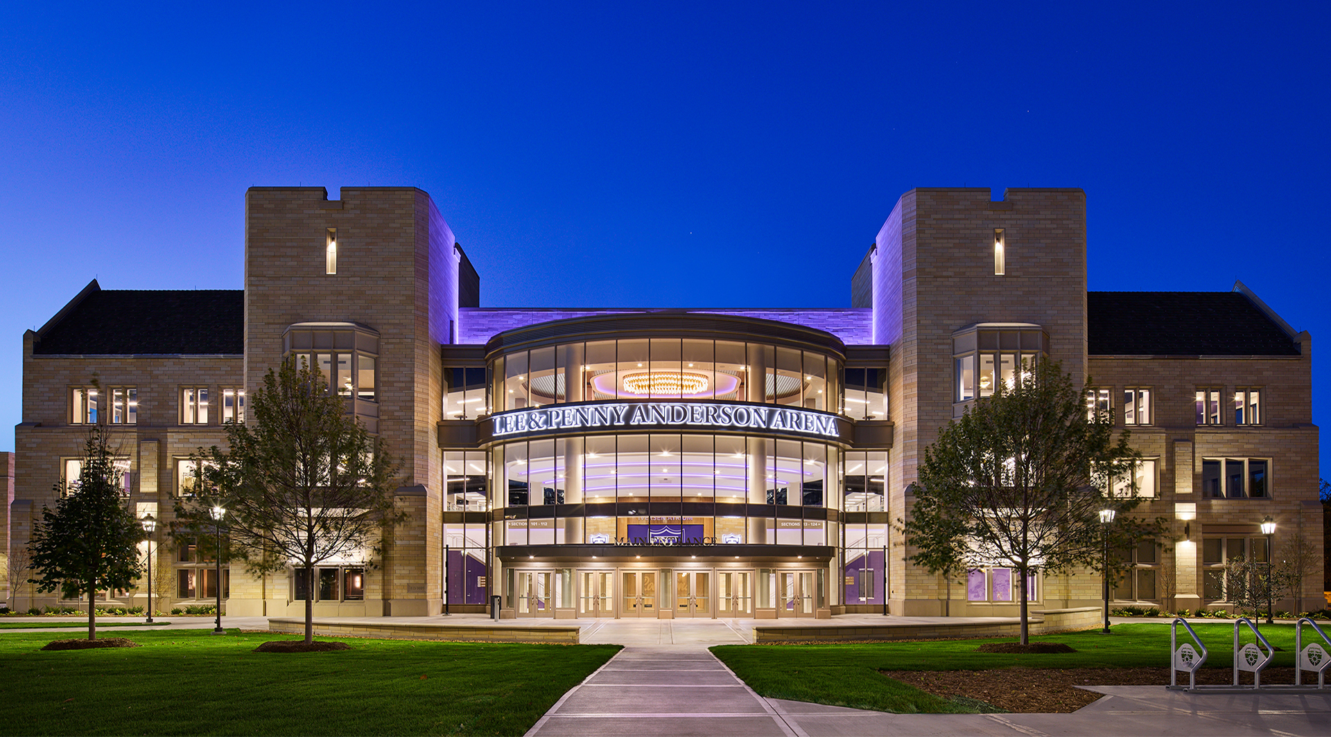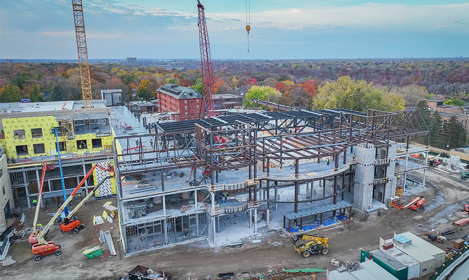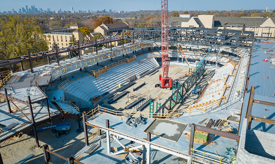 The facility’s design addresses multiple programmatic needs, including men’s and women’s basketball and hockey, with flexibility for concerts and graduations. The primary arena features 180-foot spans with operable seating that adjusts for hockey and basketball configurations. Vertically stacked practice courts, constructed with precast concrete wall panels and 70-foot-long double tees, were configured to fit within the relatively tight site. An additional ice sheet with 116-foot truss spans further enhances the facility’s versatility, providing practice and competition space for the university and community.